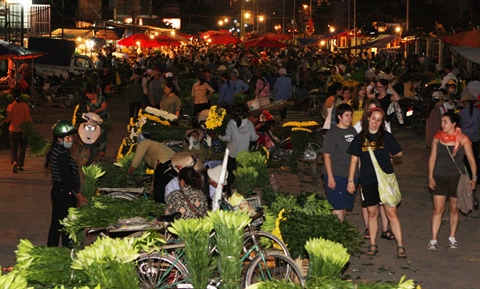 | Le marché nocturne de fleurs de Quang Ba, une destination de choix de nombreux touristes étrangers. |