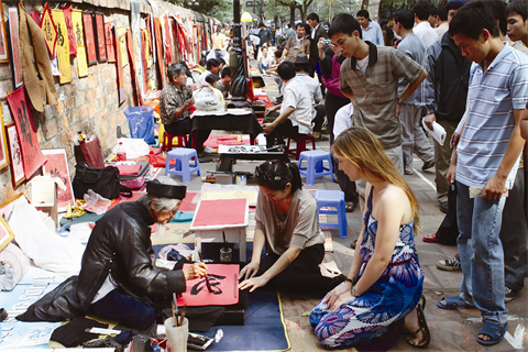 Les lettrés, une vingtaine environ, en costume traditionnel, rédigent des sentences parallèles, des vœux du Nouvel An, des mots, le tout en respectant les codes de l’art calligraphique. L’on peut y lire Tâm (cœur), Nhân (patience) ou Chân (vrai) sur des feuilles de papier rouge, sur du bois, du bambou et même sur de la soie ou de la pierre. Les visiteurs, jeunes ou âgés, profanes ou initiés, attendent patiemment que l’œuvre prenne forme sous leurs yeux en fixant les mouvements du pinceau du calligraphe qui vient lécher le support.