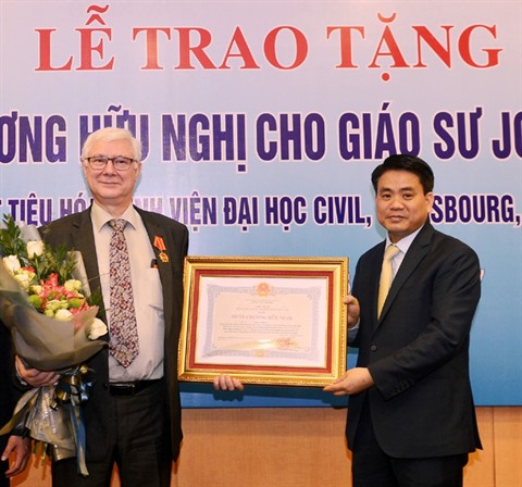 | Le président du Comité populaire de Hanoi, Nguyên Duc Chung (droite), remet l’Ordre de l’Amitié au professeur de médecine français Joel Leroy. |