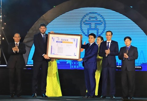 | Le représentant en chef du bureau de l’UNESCO au Vietnam, Michael Croft remet au président du Comité populaire municipal de Hanoï, Nguyên Duc Chung (droite), l’attestation reconnaissant Hanoï comme membre officiel du Réseau des villes créatives de l'UNESCO. |