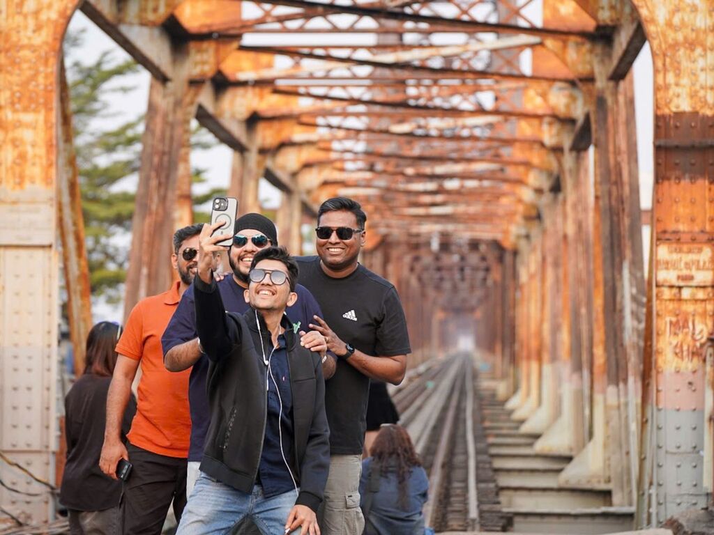 | Des touristes internationaux prennent des photos près du pont Long Biên, véritable emblème culturel de la capitale. |