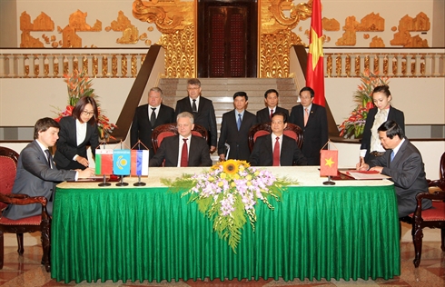 Le ministre vietnamien de l'Industrie et du Commerce, Vu Huy Hoàng, et le ministre chargé du commerce du Comité économique Asie-Europe, Andrey Slepnev, ont signé une notice conjointe sur la première séance de travail des deux délégations de négociations, en présence de MM. Nguyên Tân Dung et Viktor Khristenko.