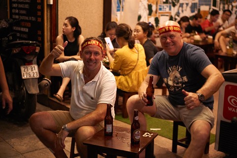 | Les touristes boivent de la bière sur les trottoirs de Hanoï. |