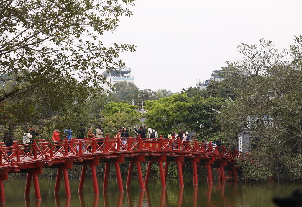 | Le lac Hoàn Kiêm (Epée restituée) et le pont Thê Huc. |