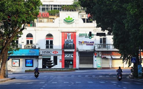 | La rue Dinh Tiên Hoàng, au cœur de Hanoï, presque désertée en raison de l'application de la distanciation sociale. |
