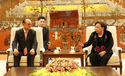 | La présidente du Conseil populaire de Hanoï, Nguyên Thi Bich Ngoc, reçoit le président du groupe de Charmvit. |