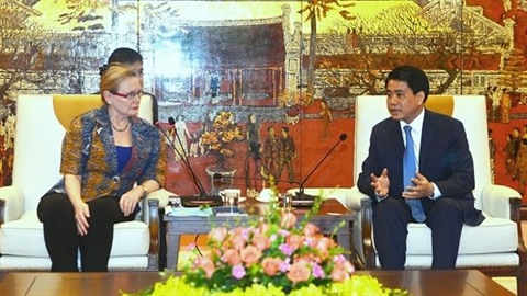 | Le président du Comité populaire de la ville de Hanoï, Nguyên Duc Chung, et la gouverneure de la province du Cap occidental de l’Afrique du Sud, le 11 septembre à Hanoï. |