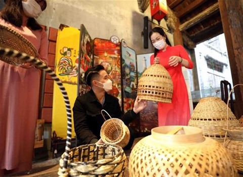 | Des touristes visitant le temple Quan Dê dans le Vieux quartier de Hanoï et se renseignant sur des produits artisanaux en bambou et en rotin. |