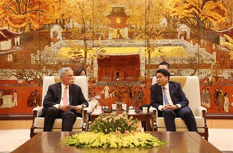| Le président du Comité populaire municipal de Hanoï Nguyên Duc Chung (droite) et le Pdg du groupe Formula One, Chase Carey. |