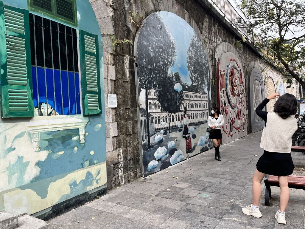 | Deux jeunes filles posent à côté des fresques dans la rue hanoïenne Phùng Hung. |