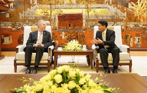 | Le président du Comité populaire municipal de Hanoï, Nguyên Duc Chung (droite), et l’ambassadeur des États-Unis au Vietnam, Ted Osius, le 21 mars. |
