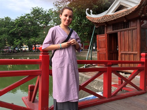 | Une touriste étrangère enfile le vêtement couvrant avant de visiter le temple Ngoc Son. |