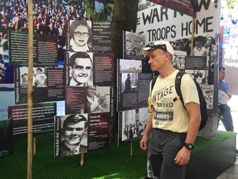 | Un visiteur étranger à l'exposition "Carnet de paix" à la Maison centrale de Hoa Lo, à Hanoï. |