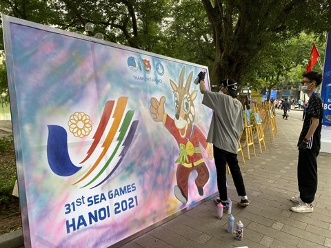 | Un jeune fait un panneau des SEA Games 31 dans la zone piétonnière de Hanoï. |
