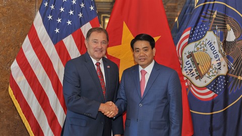 | Le président du Comité populaire de Hanoï, Nguyên Duc Chung (droite), et le gouverneur d’Utah, Gary Herbert. |