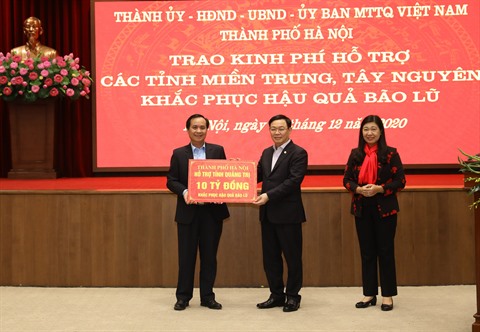 | Le secrétaire du Comité du Parti de Hanoï, Vuong Dinh Huê (centre), remet symboliquement 10 milliards de dôngs à la province de Quang Tri. |