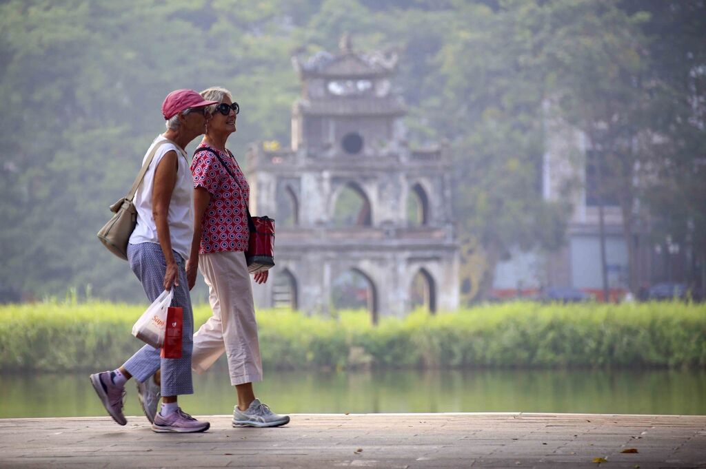 | Des touristes étrangers se promènent au bord du lac de Hoàn Kiêm à Hanoï. |