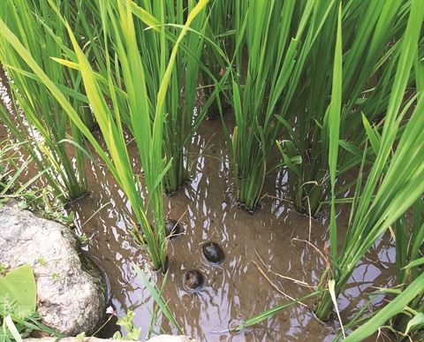 | Pomacea canaliculata, une espèce d’escargot envahissante, découverte récemment dans la Réserve naturelle de Pù Hu. |