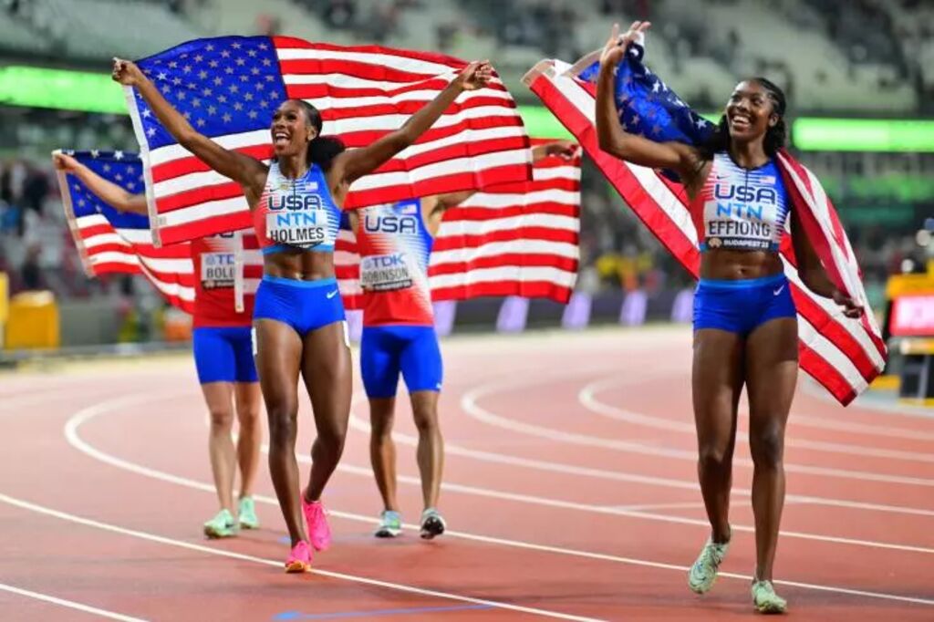 Les Etats-Unis, avec le quatuor Justin Robinson, Rosey Effiong, Matthew Boling et Holmes, en ont profité pour s'imposer dans cette discipline récente, disputée depuis 2019 en grands championnats, avec un record du monde à la clef (3:08.80), loin devant la Grande-Bretagne et la République tchèque.