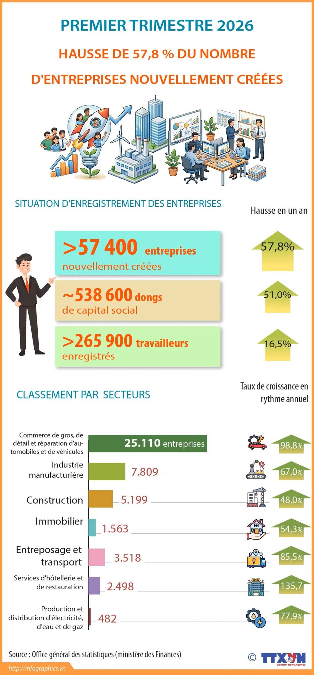 Au cours des trois premiers mois de l’année, le pays a enregistré plus de 57.400 entreprises nouvellement créées, soit une hausse de 57,8% par rapport à la même période de l’année précédente.