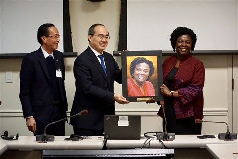 | Le secrétaire du Comité du Parti pour Hô Chi Minh-Ville, Nguyên Thiên Nhân, offre un cadeau à Victoria Kwakwa, vice-présidente de la Banque mondiale chargée de l'Asie de l'Est et du Pacifique |