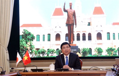 | Le président du Comité populaire municipal de Hô Chi Minh-Ville, Nguyên Thành Phong, lors d'une séance de travail virtuelle avec le gouverneur de la préfecture japonaise d’Aichi, Ohmura Hideaki. |