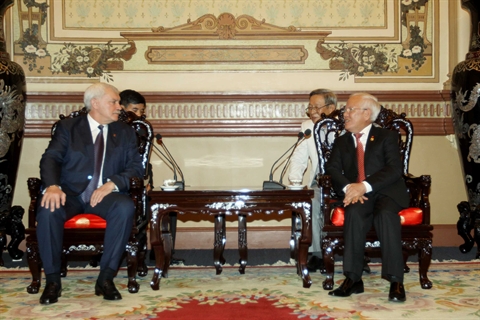 | Le président du Comité populaire de Hô Chi Minh-Ville, Lê Hoàng Quân (droite), et le gouverneur de Saint-Pétersbourg, Georgy Poltavchenko, le 8 décembre dans la mégapole du Sud. |
