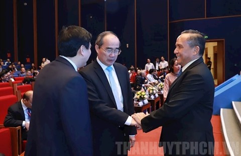 | Le secrétaire du Comité du Parti pour Hô Chi Minh-Ville, Nguyên Thiên Nhân (centre), et des délégués au forum du secteur économique privé. |