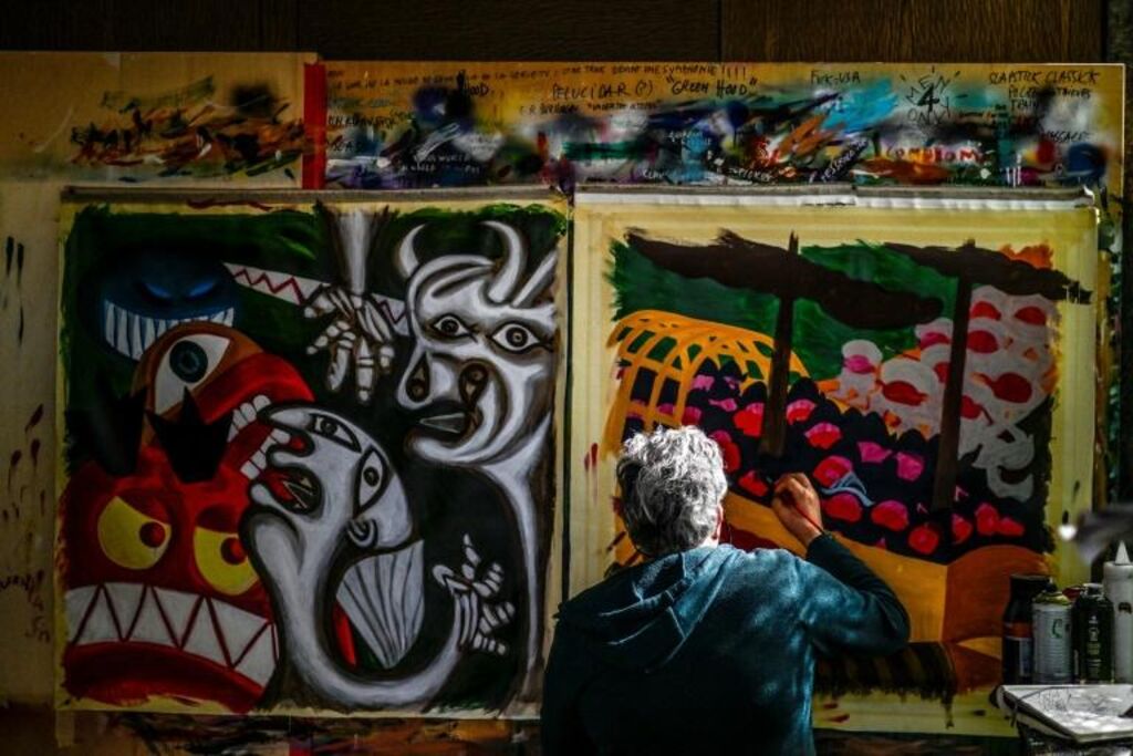 | L'artiste français Hervé Di Rosa travaille sur une peinture dans son studio à Lisbonne, le 16 mars. |