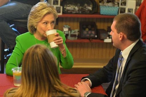 | Hillary Clinton prend un verre avec des habitants dans un café de Le Claire, dans l'Iowa, au premier jour de sa campagne électorale pour la présidentielle de 2016. |