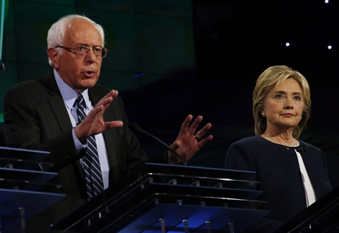 | Hillary Clinton et Bernie Sanders, tous deux candidats à l'investiture démocrate s'expriment lors d'un débat télévisé, le 13 octobre |