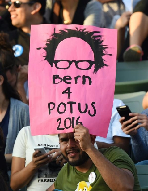 | Bern pour président des États-Unis" lit-on sur une affiche en faveur de Bernie Sanders lors d'une réunion électorale à Carson en Californie le 17 mars. |