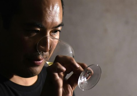 | "Ma philosophie : faire du vin juste avec des raisins, sans levure, sans sucre et sans sulfites", explique Hirotake Ooka, ici dans sa cave de Saint-Péray, en Ardèche, le 26 septembre 2016. |