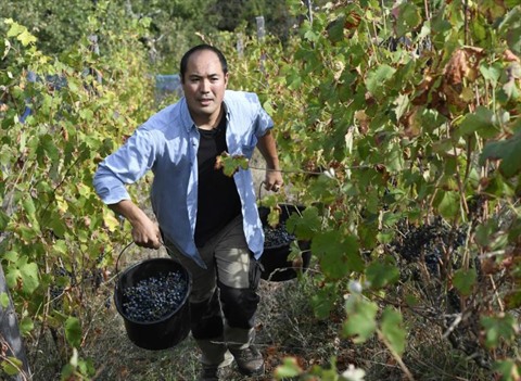 | Hirotake Ooka "pige" le raisin de son vignoble ardèchois, le 26 septembre 2016 à Saint-Péray, près de Valence. |