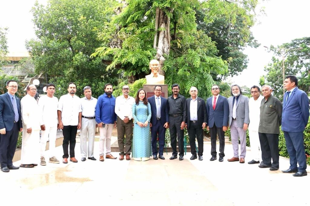 | L’ambassadrice Trịnh Thị Tâm et les délégués participants à la cérémonie prennent une photo de souvenir devant la statue du Président Hô Chi Minh au Sri Lanka. |