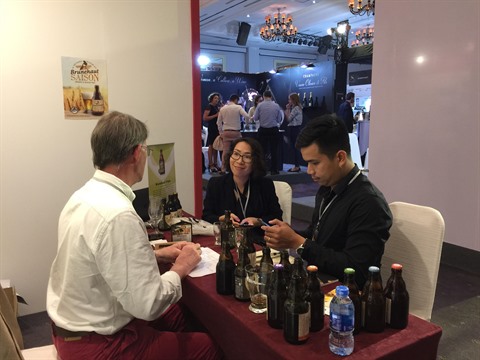 | Des visiteurs devant des stands d’exposition d’entreprises européennes à EuroSphere 2018 à Hô Chi Minh-Ville. |