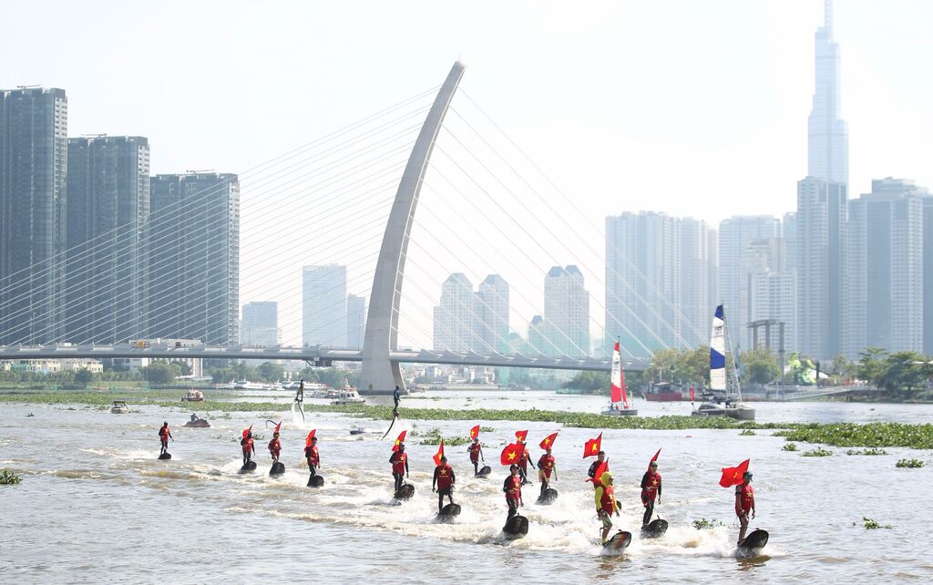 | Un spectacle de sports nautiques sur la rivière de Saïgon dans le Festival du tourisme fluvial de Hô Chi Minh-Ville. |