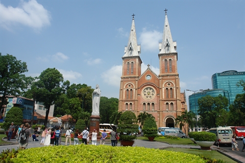 | La cathédrale de Notre-Dame à Hô Chi Minh-Ville attire de nombreux touristes, vietnamiens comme étrangers. |