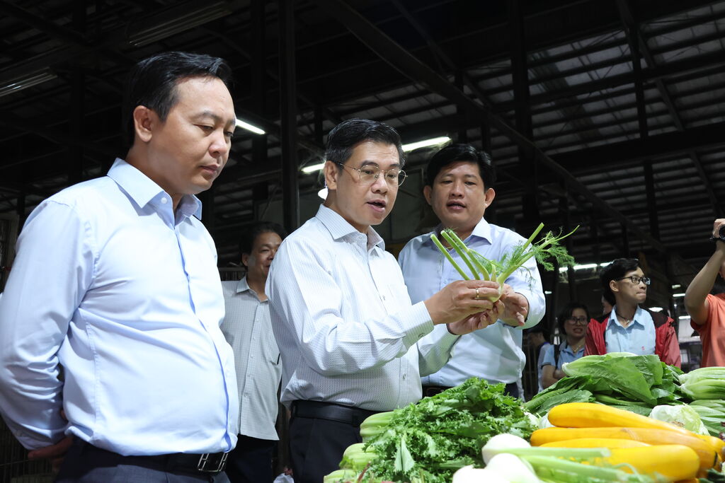 | Une inspection des dirigeants sur la sécurité alimentaire au marché de gros Binh Dien, à Hô Chi Minh-Ville. |