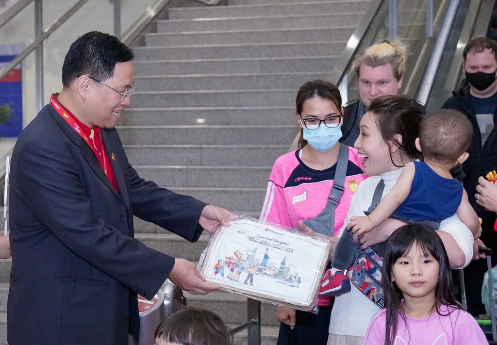 | Les représentants du Service du tourisme de Hô Chi Minh-Ville et de la Compagnie aérienne Vietjet recevaient le 1er janvier les premiers touristes étrangers à l'aéroport de Tân Son Nhât. |