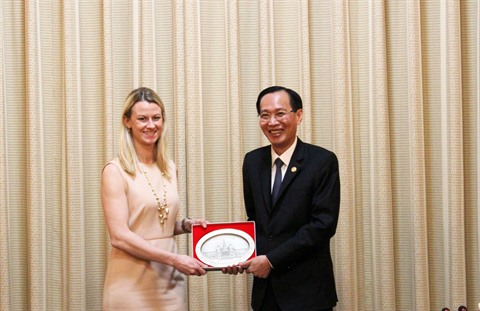 | Lê Thanh Liêm, vice-président du comité populaire municipal et Natalie Rogers, chef du bureau du sénateur américain Cory Gardener. |