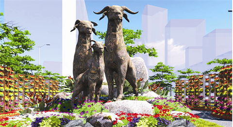 | La rue florale est ornée de statues représentant une famille de chèvres. |