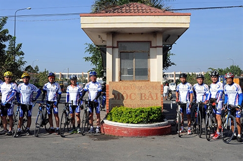 | Des membres du club cycliste Land Saigon à la porte-frontière de Môc Bài, province de Tây Ninh (Sud). |