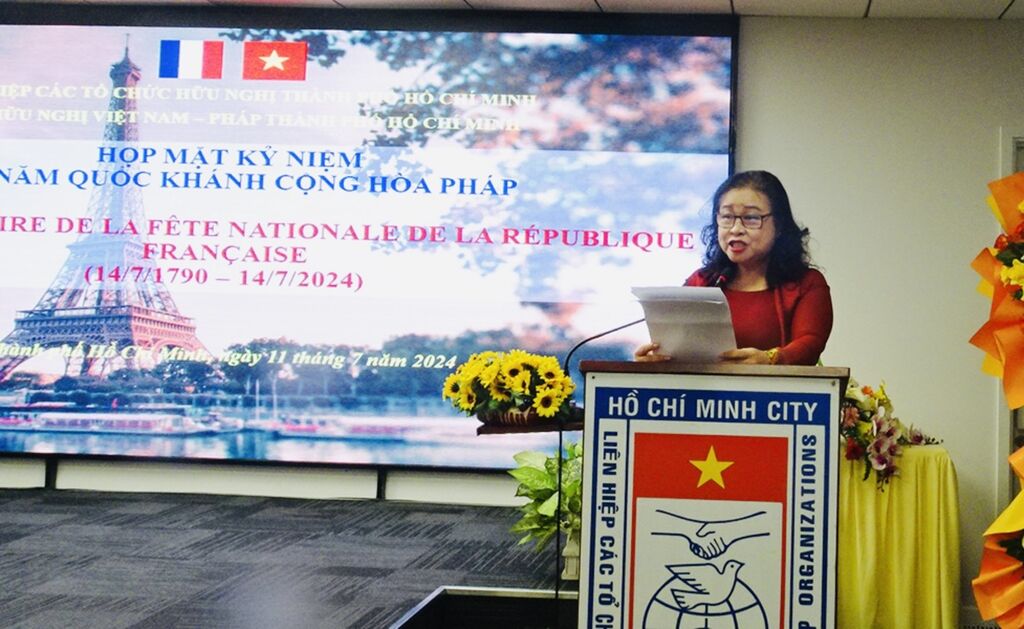 | La présidente de l'Association d'amitié Vietnam - France à Hô Chi Minh-Ville, Nguyên Thi Ngoc Dung, prononce son discours lors de l'événement, tenu le 11 juillet à Hô Chi Minh-Ville. |