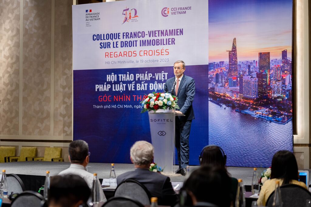 Olivier Brochet, ambassadeur de France au Vietnam, a déclaré : "En cette année anniversaire, l'ambassade a directement contribué à l'organisation de cinq colloques et séminaires en collaboration avec de nombreux partenaires, abordant des thématiques d'actualité pour nos deux pays, telles que la protection des données personnelles numériques, le commerce international et la protection du milieu marin, la médiation, les échanges commerciaux internationaux, et même la lutte contre le tabagisme. Le colloque d'aujourd'hui consacré au droit immobilier s'inscrit pleinement dans cette feuille de route, et je souhaite vous réaffirmer toute la confiance qui nous anime ici au Vietnam pour le développer davantage, compte tenu de la grande proximité qui nous lie et du dynamisme de nos acteurs juridiques pour le soutenir et le renforcer".