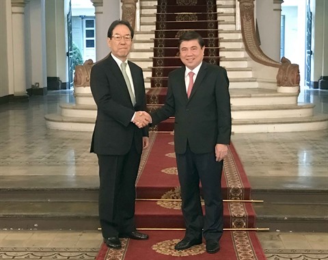 | Nguyên Thành Phong (droite), président du Comité populaire de Hô Chi Minh-Ville, et Keiji Kimura, président de l’Association des entreprises japonaises participant au développement des éco-villes à l’étranger. |