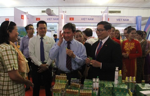 | Des visiteurs dans un stand de la 2e foire-exposition internationale de l'ASEAN, le 18 juillet en 2018 à Hô Chi Minh-Ville. |