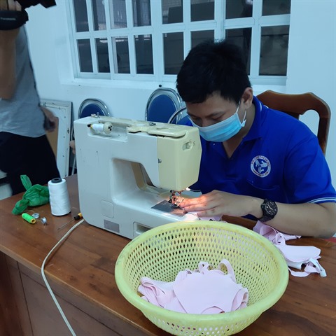 | Un membre du Centre d'assitance des jeunes de Hô Chi Minh-Ville fait des masques afin de les offrir aux habitants |