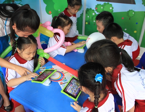 | Les élèves primaires s’intéressent aux manuels électroniques. Photo : VNA/CVN |