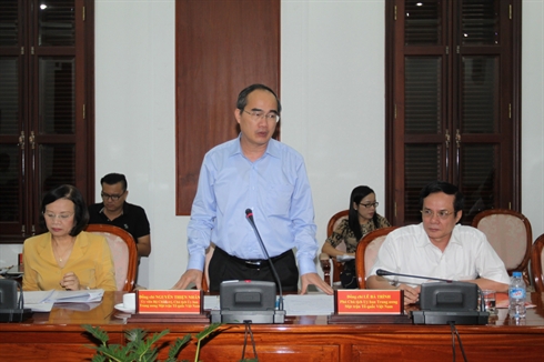 | Le président du Comité central du Front de la Patrie du Vietnam, Nguyên Thiên Nhân (debout), travaille lundi 18 août avec les autorités de Hô Chi Minh-Ville. |